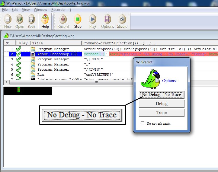 جب آپ کام ریکارڈ کرنے سے فارغ ہوجائیں تو ٹولز بار میں سے Playکے بٹن پر کلک کریں۔ ایک چھوٹی سے ونڈو ظاہر ہوگی جس میں تین بٹنز موجود ہونگے۔ آپ ان بٹنز میں سے No Debug – No Trace کے بٹن پر کلک کریں۔