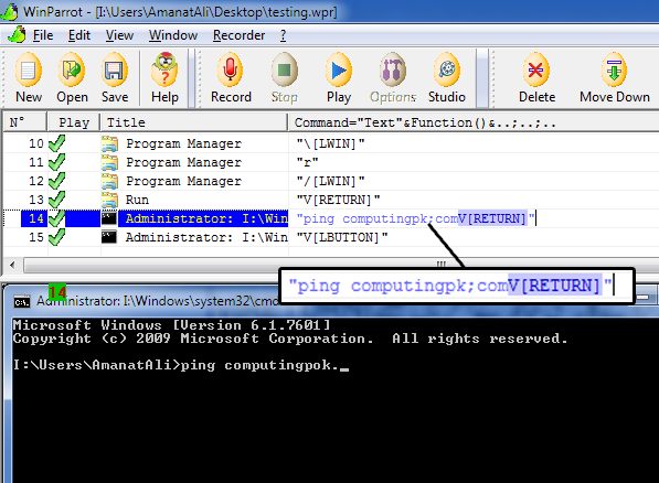کسی مرحلے یا کمانڈ کو مدون کرنے کے لئے آپ اس پر کلک کریں۔ جیسے ہی آپ کلک کریں گے، کمانڈ مدون کرنے کے قابل ہوجائے گی۔ یہاں آپ اپنی مرضی سے کمانڈ میں تبدیلی کرسکتے ہیں۔ یہاں آپ کو بتاتے چلیں کہ ون پیرٹ فل اسٹاپ (.) کو سیمی کولن (;) سے بدل دیتا ہے۔ یعنی اگر آپ نے کہیں پر xyz.comلکھا ہے تو ون پیرٹ اسے xyz;comکردے گا۔ آپ کو خود اس کمانڈ کو مدون کرکے سیمی کولن کی جگہ فل اسٹاپ لکھنا ہوگا۔ بصورت دیگر ون پیرٹ آپ کے کام کا ستیا ناس کردے گا۔ کسی کمانڈ کے آخر میں لکھے V[RETURN] کا مطلب ہے کہ آپ نے یہاں اینٹر کا بٹن دبایا ہے۔ آپ چاہیں تو خود بھی کوئی کمانڈ ترتیب کے بیچ میں شامل کرسکتے ہیں۔