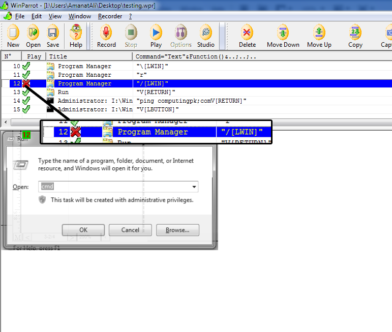 اسی طرح اگر آپ کسی مرحلے کو غیر فعال کرنا چاہتے ہیں تو اس کے دائیں جانب موجود a کے نشان پر کلک کردیں۔ a کا نشان r میں بدل جائے گا۔ یعنی اب یہ مرحلہ یا کمانڈ نہیں چلے گی۔ اس طرح آپ کسی مرحلے کو کسی دوسری کمانڈ سے پہلے یا بعد میں چلانے کے لئے اوپر یا نیچے بھی کرسکتے ہیں۔